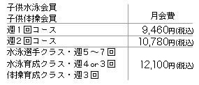 子供共通会員・月会費=(水泳月会費+体操月会費)-1,100円 |